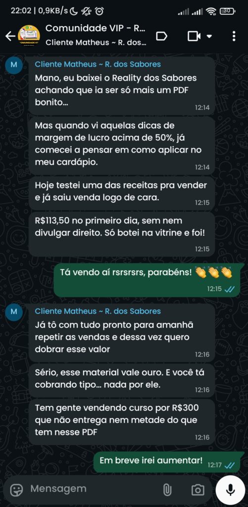 Hoje, na Comunidade VIP, um aluno me agradeceu pelos resultados que alcançou aplicando o que ensino no Reality dos Sabores. É isso que me dá força pra continuar entregando o meu melhor todos os dias!